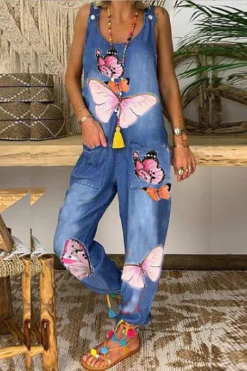 Wholesale Women's Butterfly Print Denim Jumpsuit