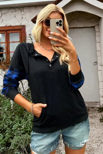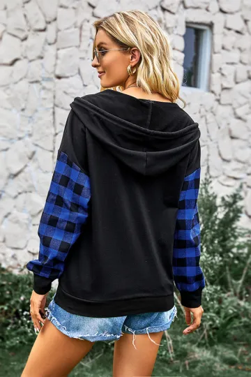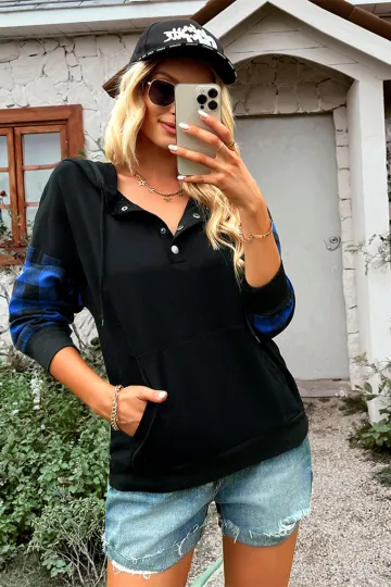 Wholesale Women's Casual Plaid Panel Hooded Loose Top