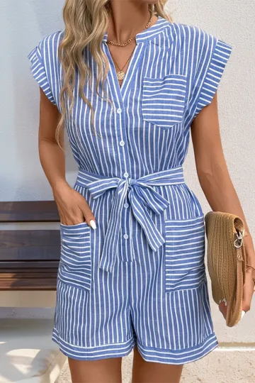 Wholesale Women's Casual Colorful Striped Jumpsuit Pocket Button Tie Short Sleeve Jumpsuit