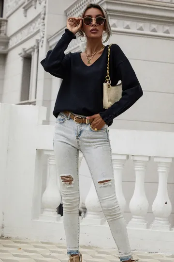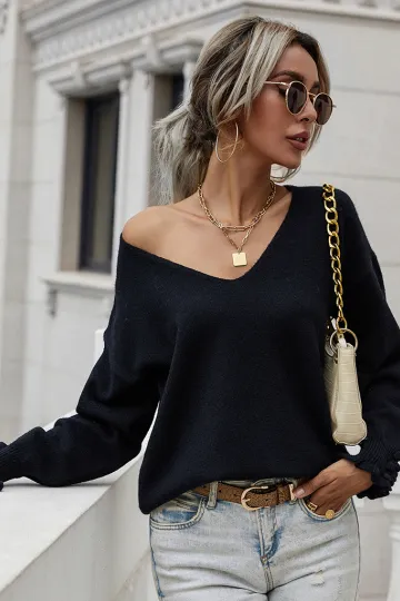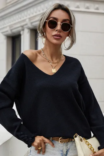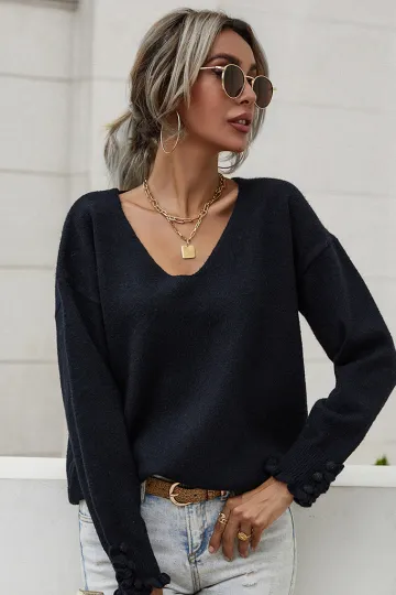 Wholesale Women'S Cuff Button Loose Solid Pullover Sweater