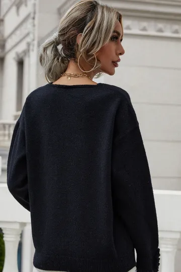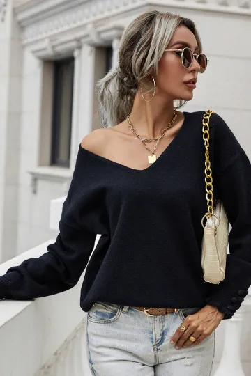 Women'S Cuff Button Loose Solid Pullover Sweater