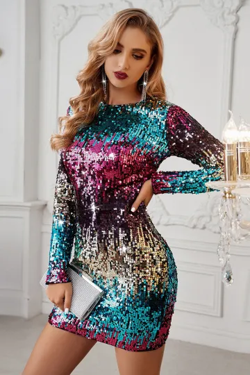 Wholesale Women's Gradient Color Contrast Sequin Long Sleeve Hip Cover Party dress