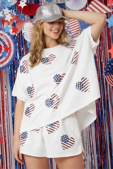 Wholesale Women's Independence Day Top Sequin Pants Suit Short Sleeve Two-piece Suit