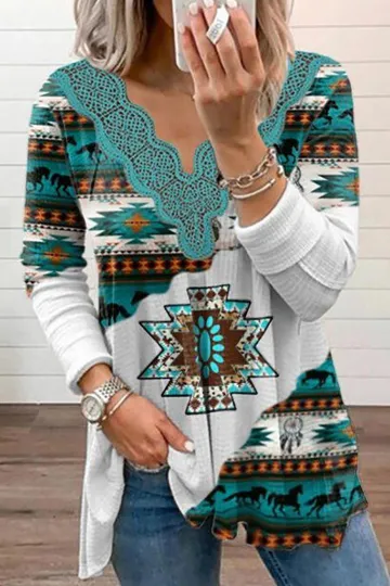 Women's Knitted Casual Ethnic Aztec Print Lace Top