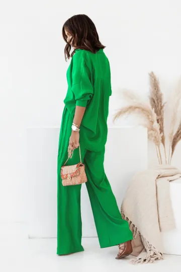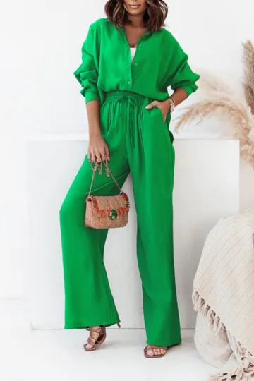 Wholesale Women's loose solid color long-sleeved shirt casual trousers two-piece set