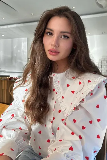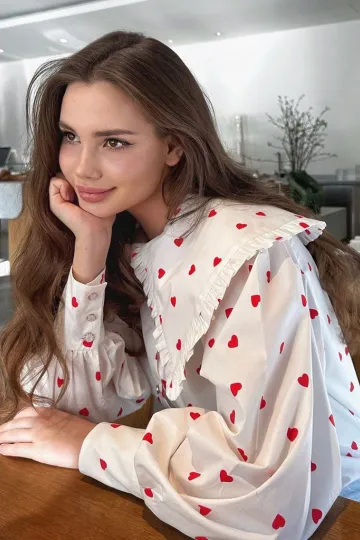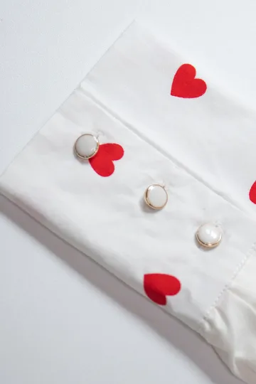 Women's New Red Love Print Doll Collar Lantern Sleeve Shirt