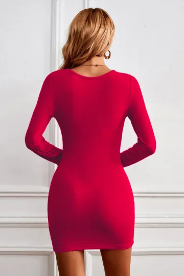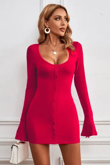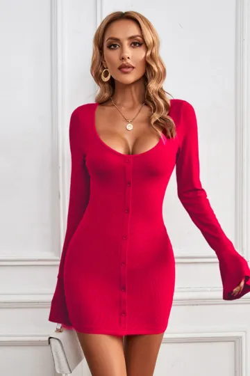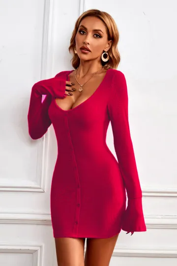 Women's Sexy hip skirt single-breasted U-neck knitted long-sleeved temperament dress