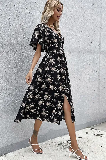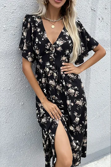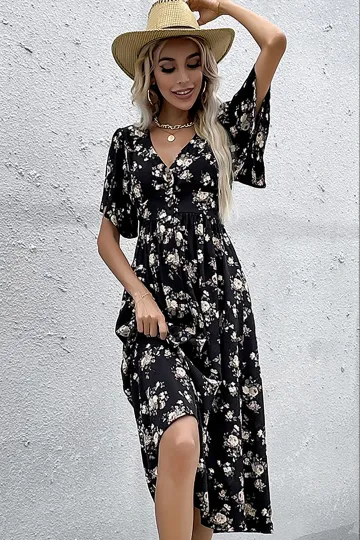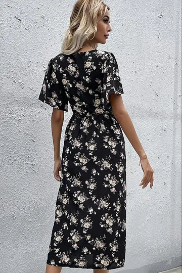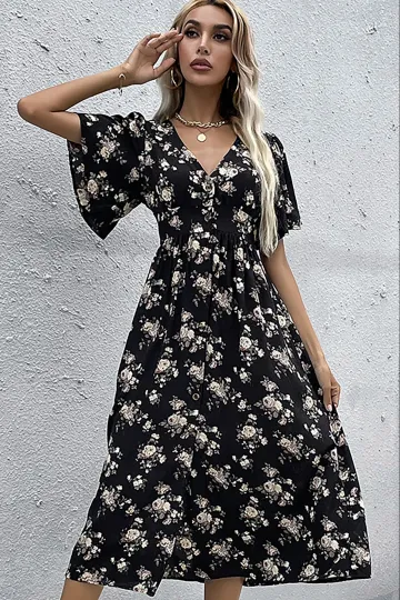 Women'S Short Sleeve Printed V-Neck Midi Dress