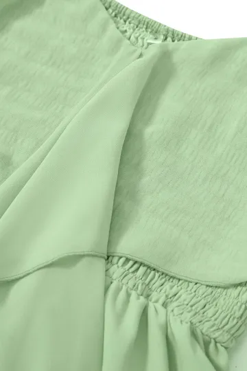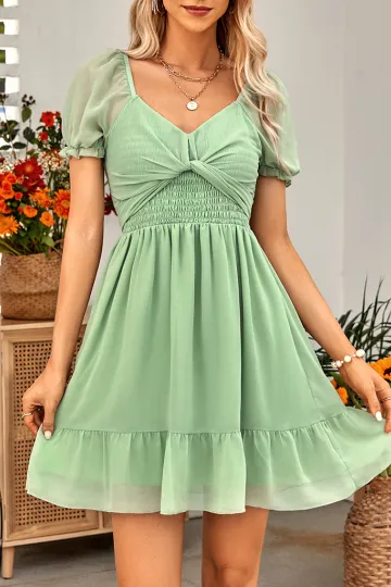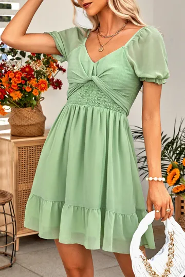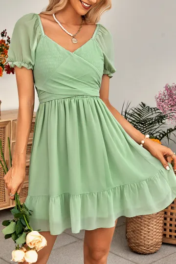 Women's spring and summer V-neck solid color waist short-sleeved dress