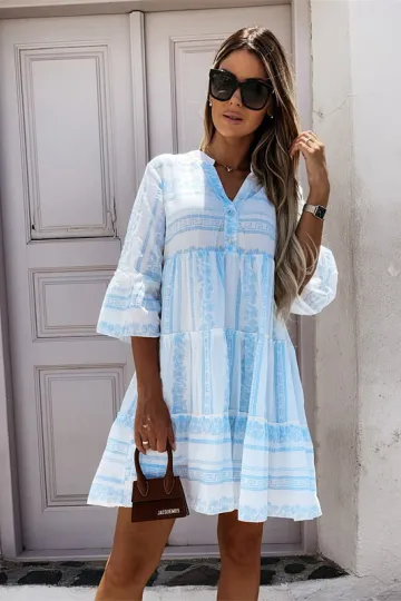 Women's V-Neck Loose Flare Sleeve Ruffle Printed Dress