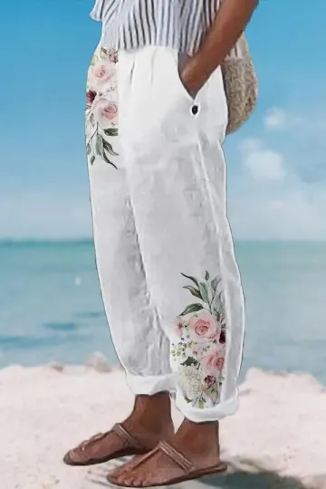 Wholesale Women Floral Print Loose Cotton Linen Trousers