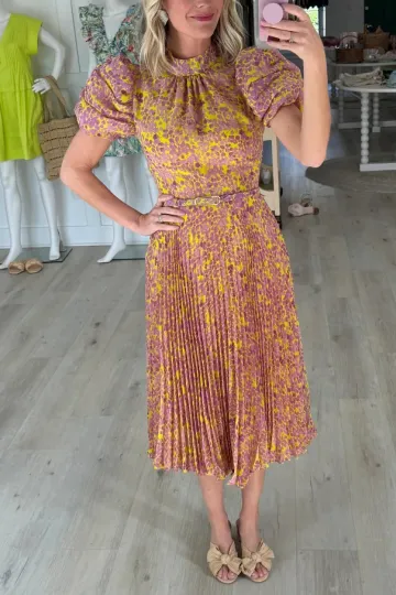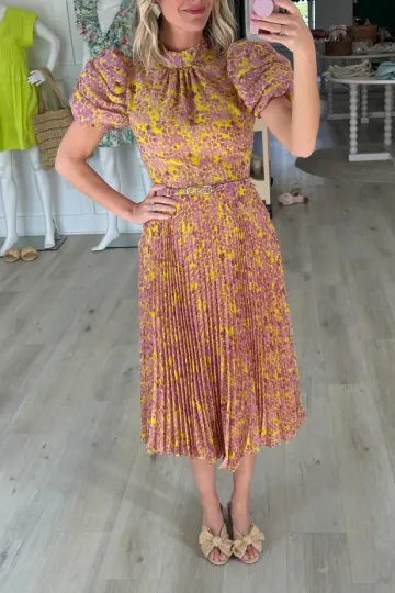 Yellow Belt Purple Flower Belt Midi Dress