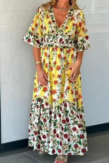 Yellow Floral Short Sleeve V Neck Maxi Dress