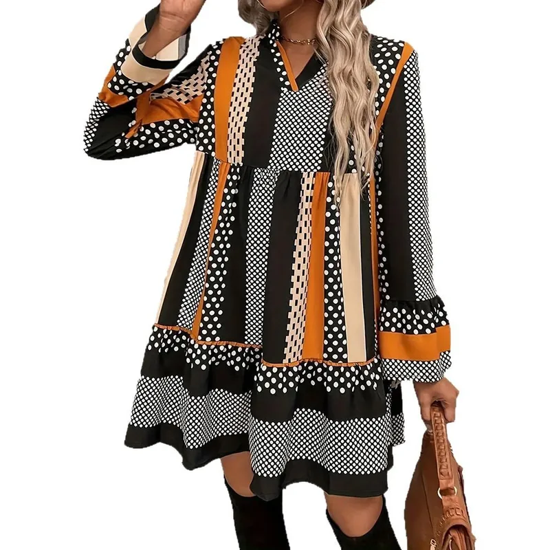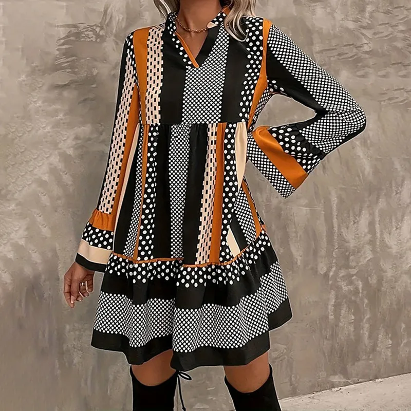 Wholesale Women's Adults A- Line Skirt Casual Style Japanese and Korean Leisure V Neck Basic Model Long Sleeve Geometric Knee-Length Daily Festival