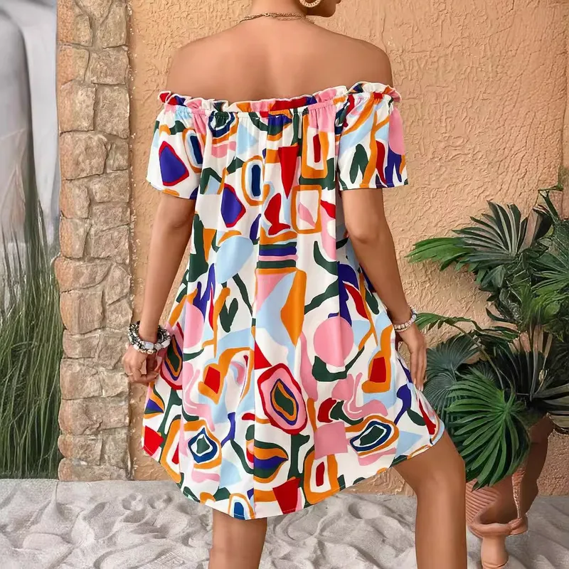 Wholesale Women's Adults A- Line Skirt Elegant Style Temperament Commuter Boat Neck Basic Model Pleated Edge Short Sleeve Plant Flowers Above Knee Casual Weekend