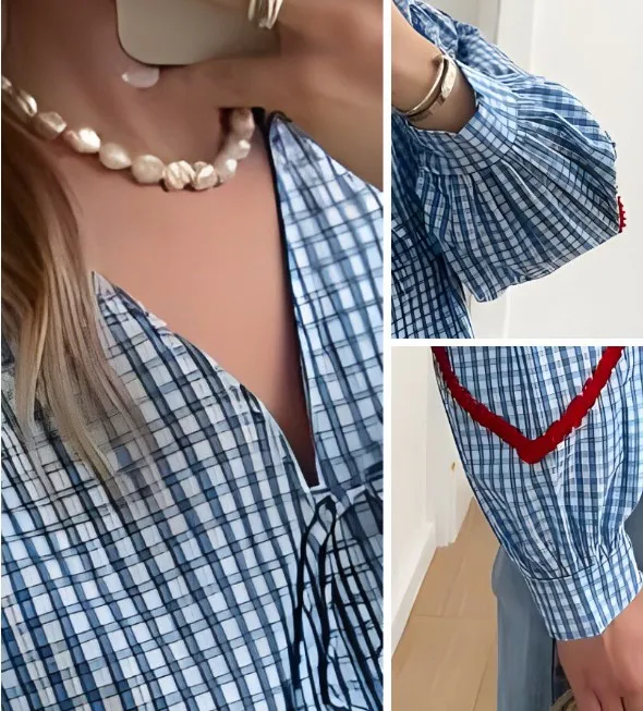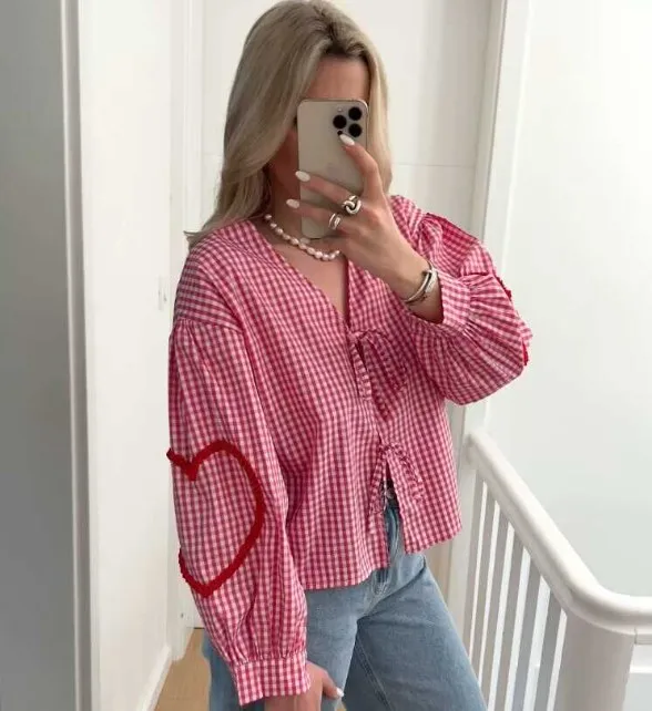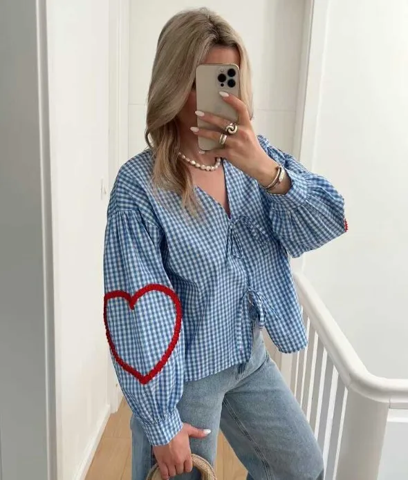 Wholesale Women's Blouse Long Sleeve Blouses Simple Style Plaid Heart Shape