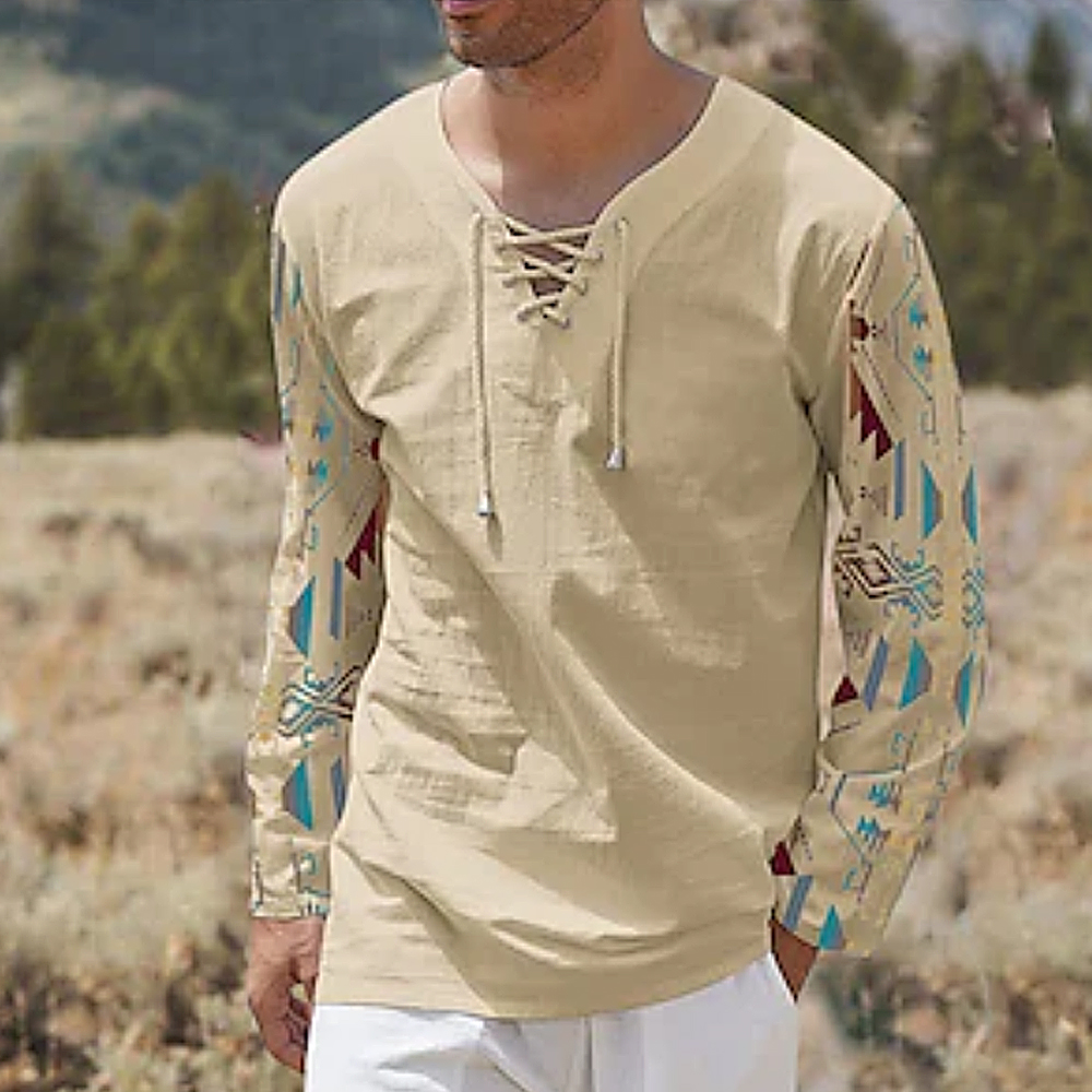 With the shirt laid flat, back facing up, place the tape at the point on the bottom seam of the yoke where the yoke attaches to the sleeve. Measure straight across to the same point on the other side of the shirt
