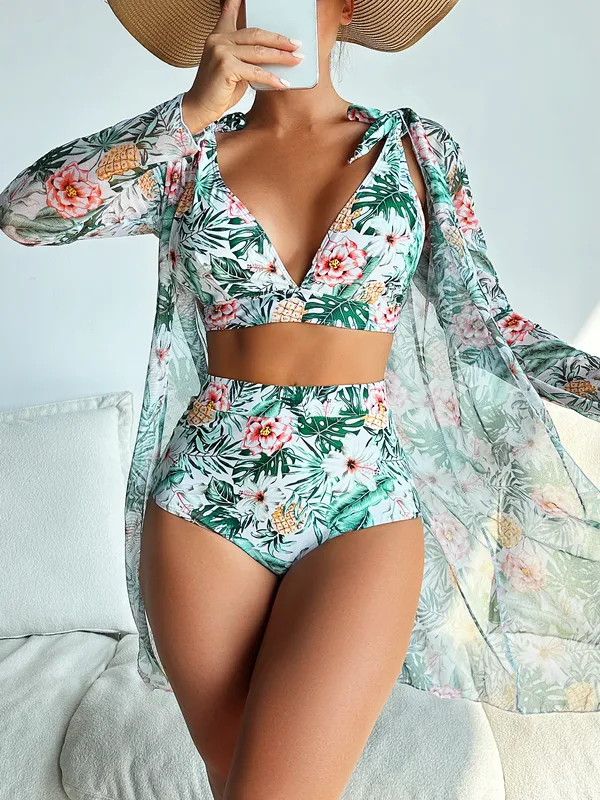 Women's Elegant Printing Flower 3 Pieces Set Bikinis Swimwear