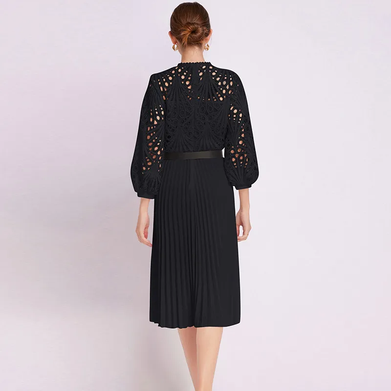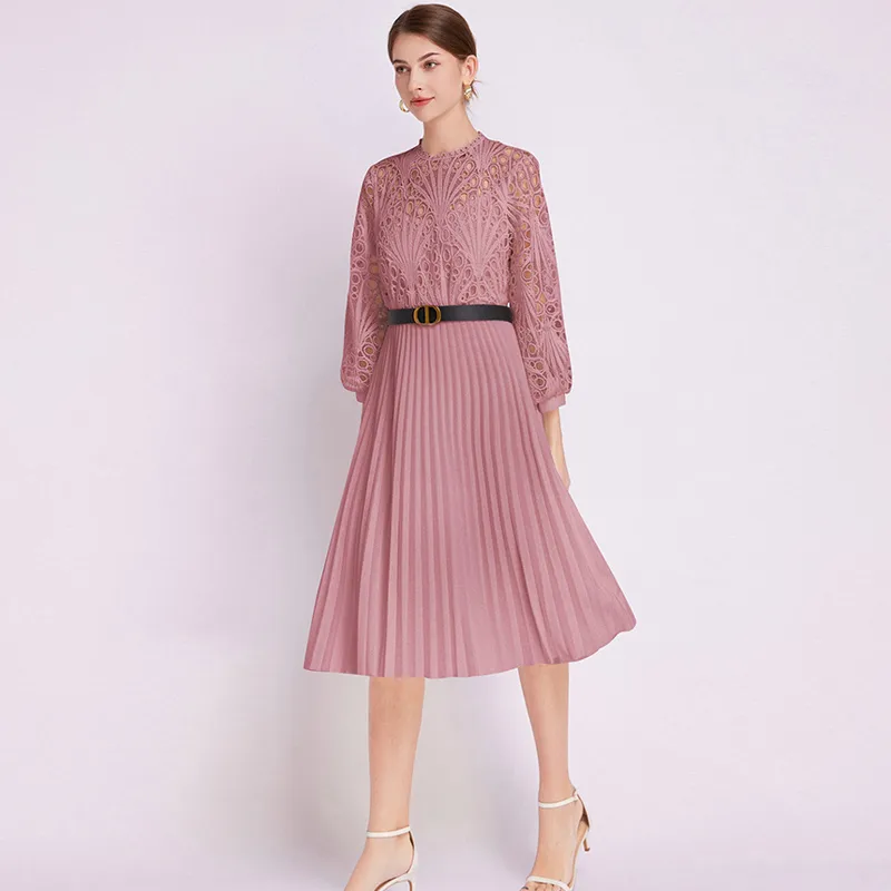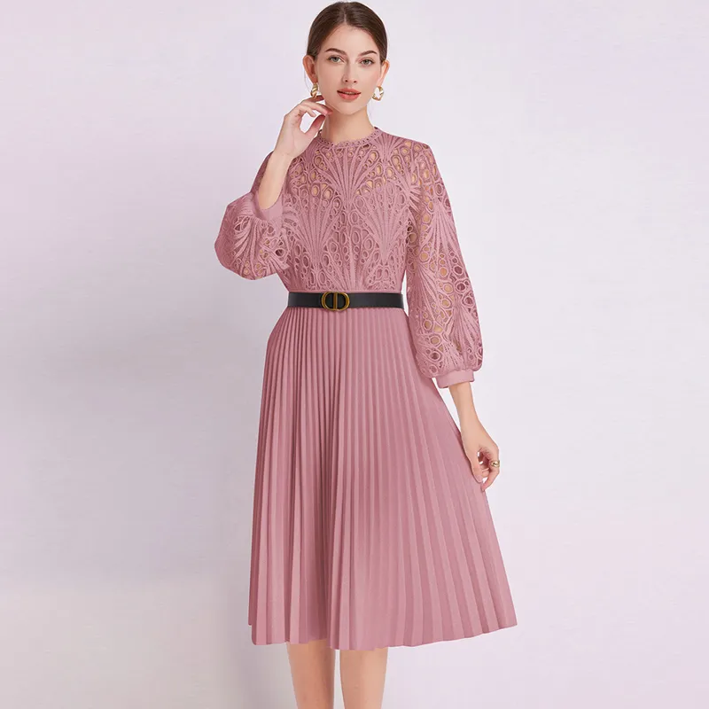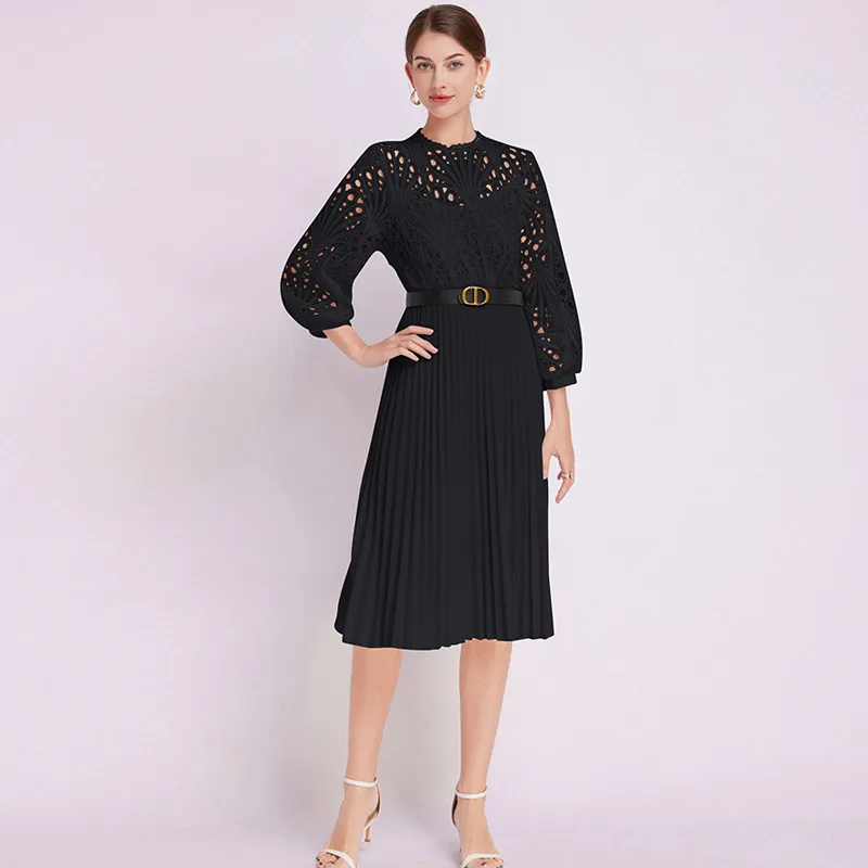 Wholesale Women's Lace Dress Sexy British Style Round Neck Nine Points Sleeve Solid Color Midi Dress Outdoor Tea Party