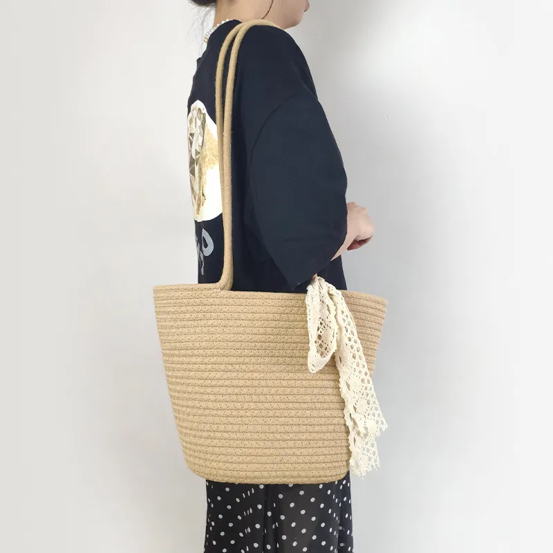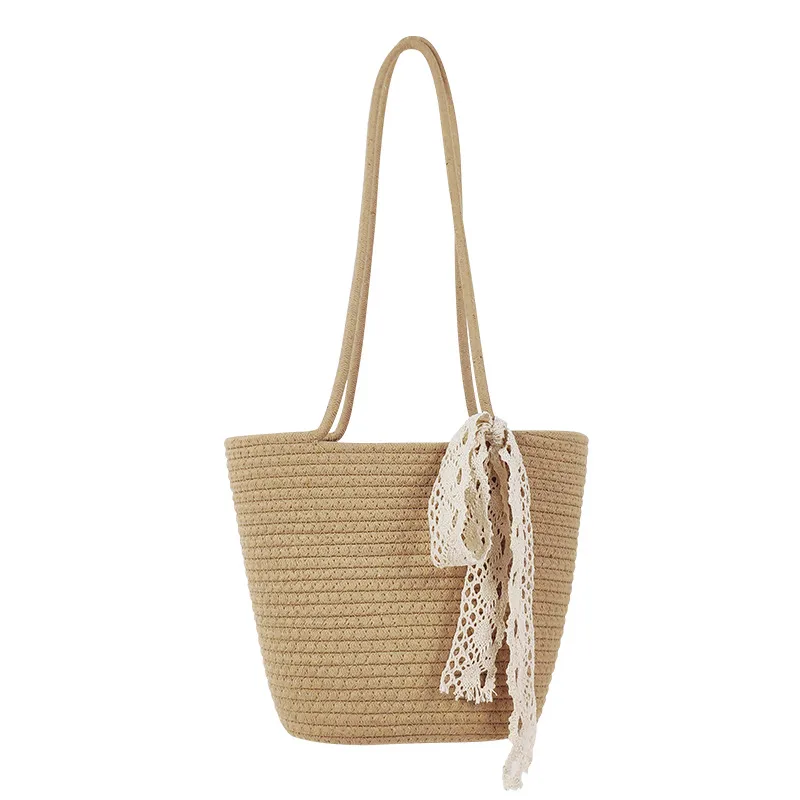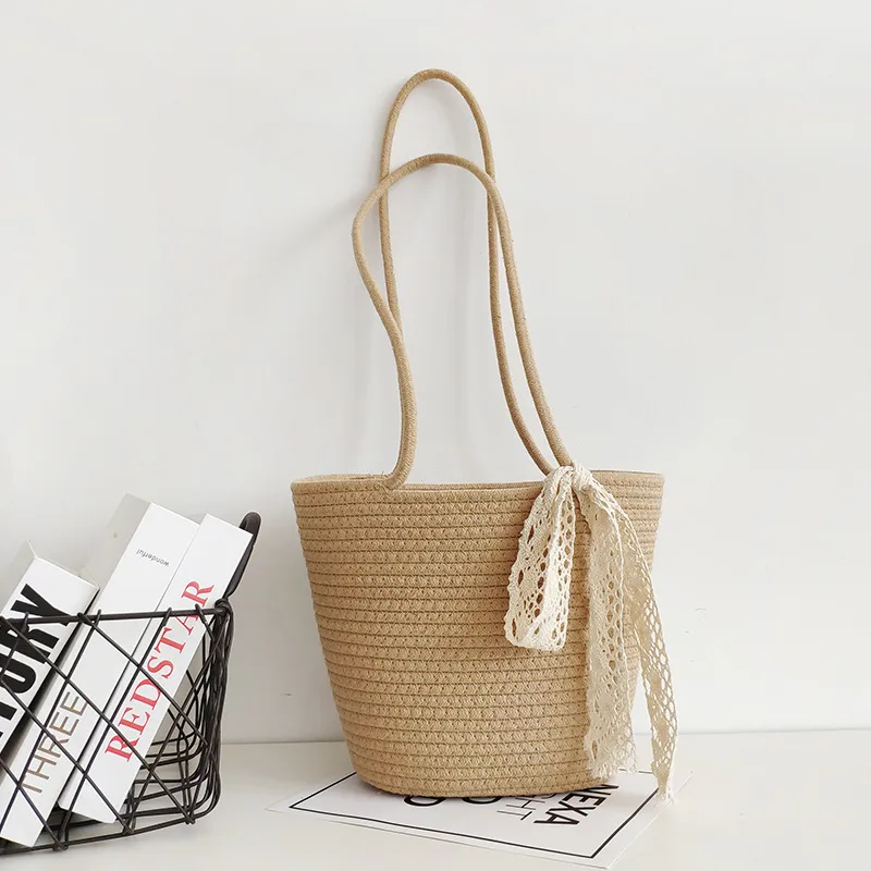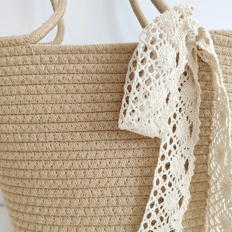 Wholesale Women's Medium Cotton Solid Color Beach Weave Sewing Thread Square Open Straw Bag