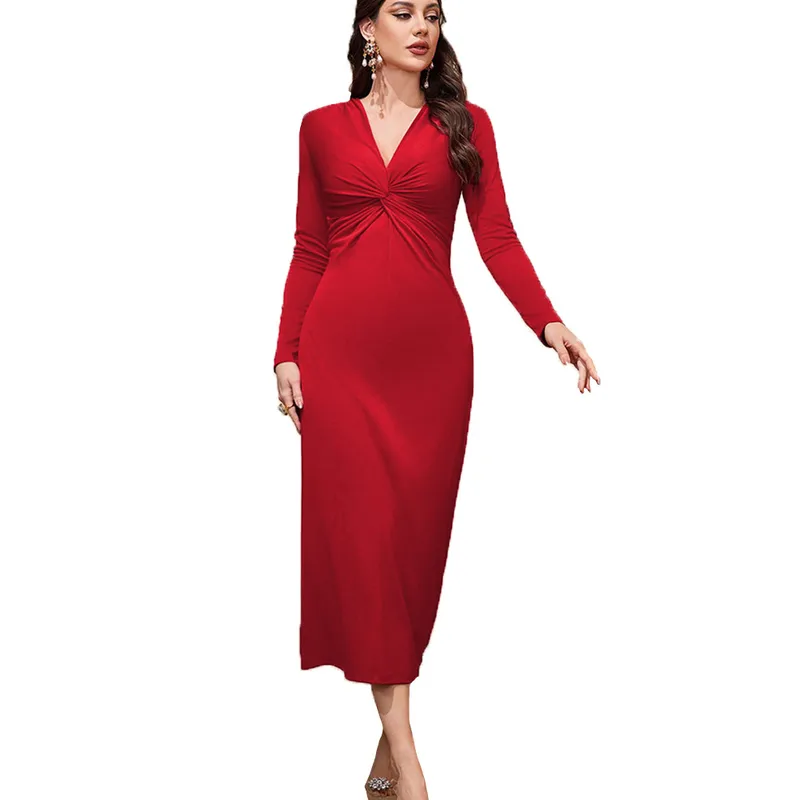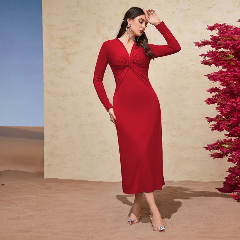 Wholesale Women's Party Dress Elegant V Neck Sheath Dress Long Sleeve Solid Color Midi Dress Cocktail Party