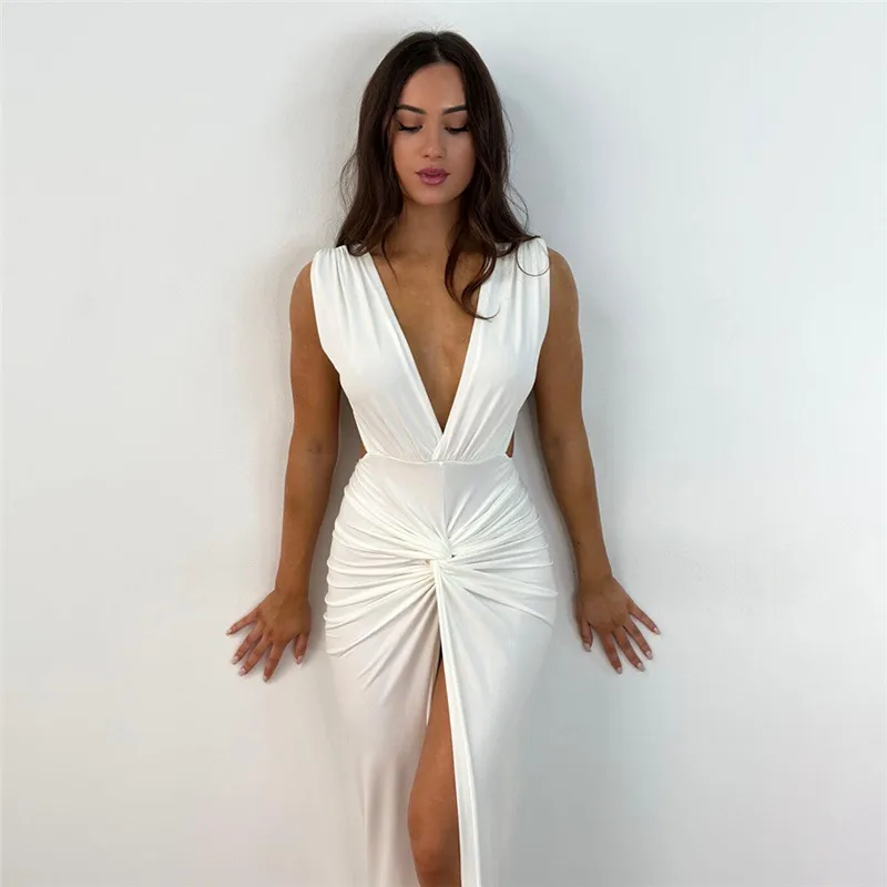 Wholesale women's pencil skirt fashion v neck slit knot backless sleeveless solid color maxi long dress daily