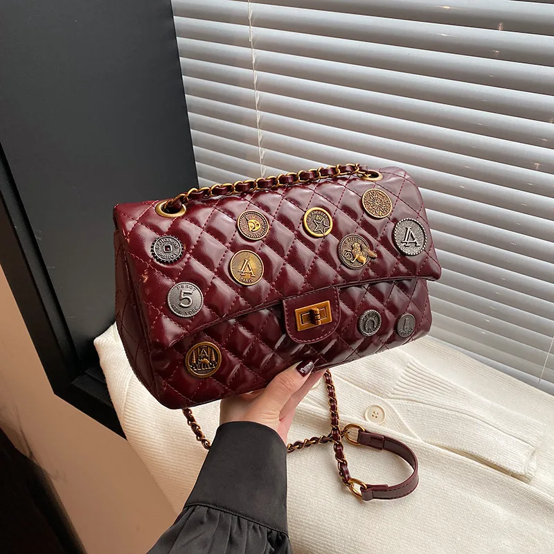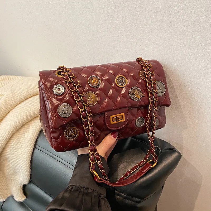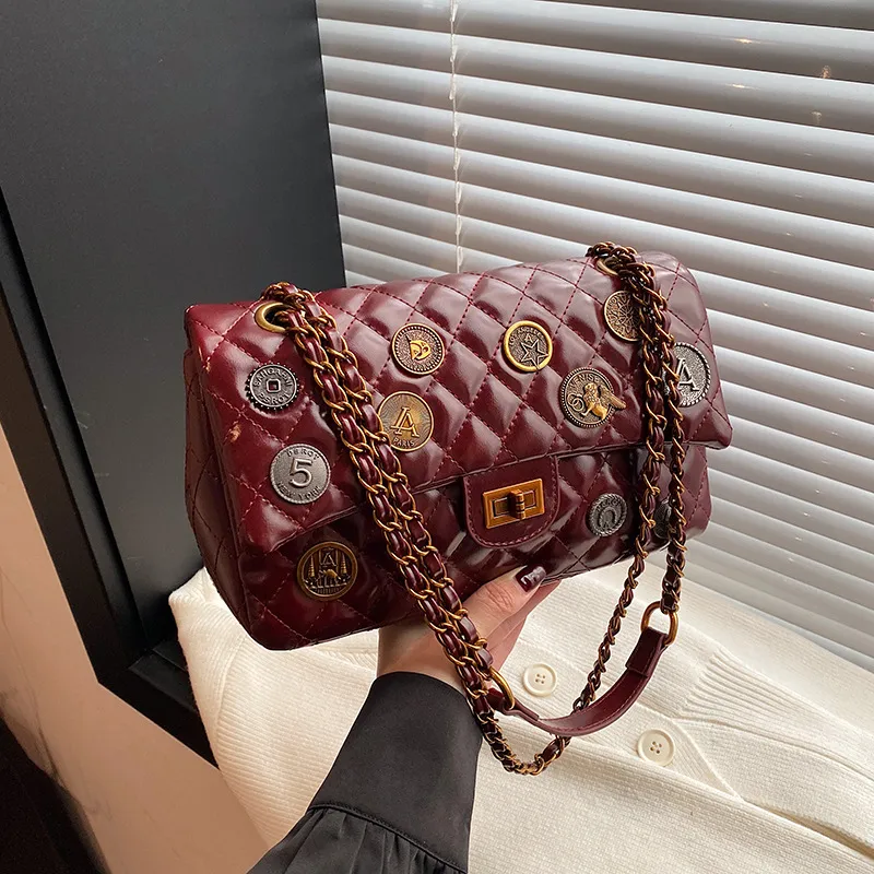 Wholesale Women's Pu Leather Solid Color Lingge Classic Style Sewing Thread Square Lock clasp Shoulder Bag