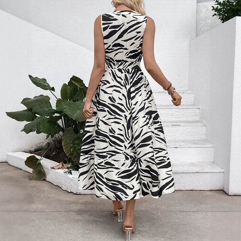 Wholesale Women's Sheath Dress Casual V Neck Pleated Sleeveless Zebra Midi Dress Daily