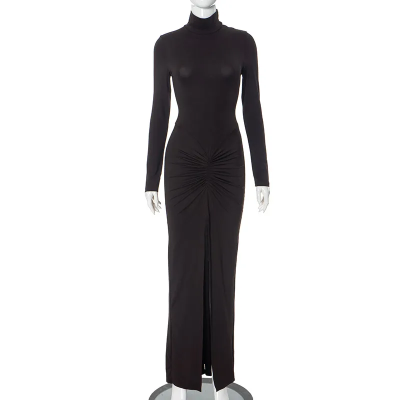 Wholesale Women's Sheath Dress Elegant Round Neck Slit Pleated Long Sleeve Solid Color Maxi Long Dress Banquet