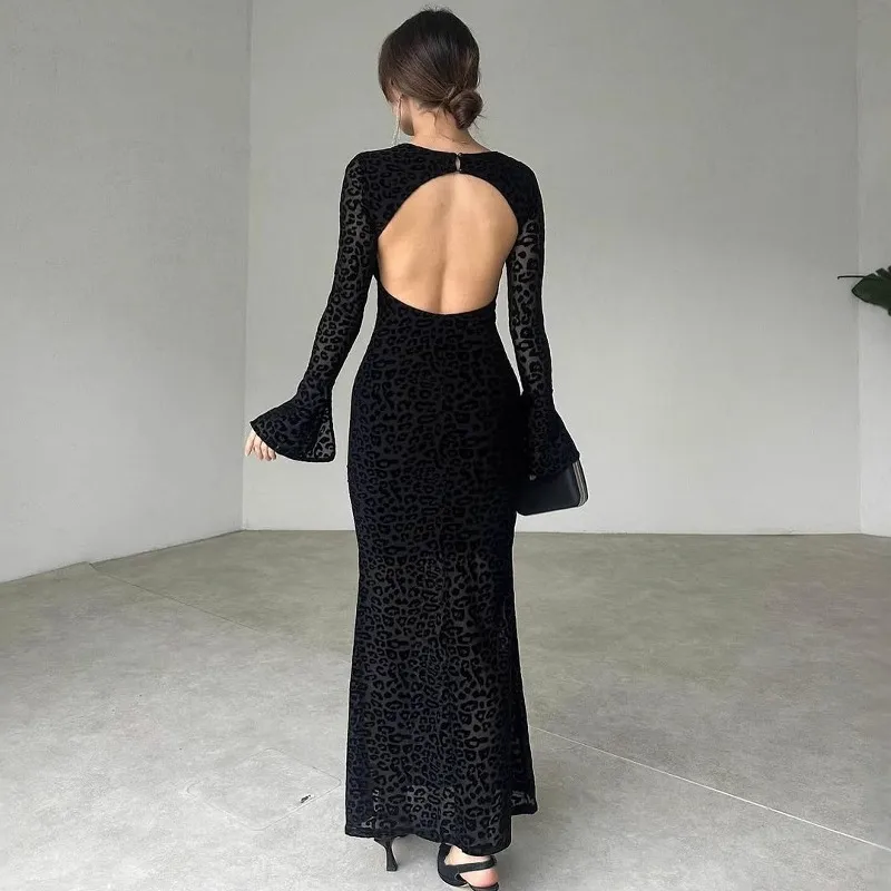 Wholesale Women's Sheath Dress Streetwear Round Neck Backless Long Sleeve Solid Color Maxi Long Dress Holiday