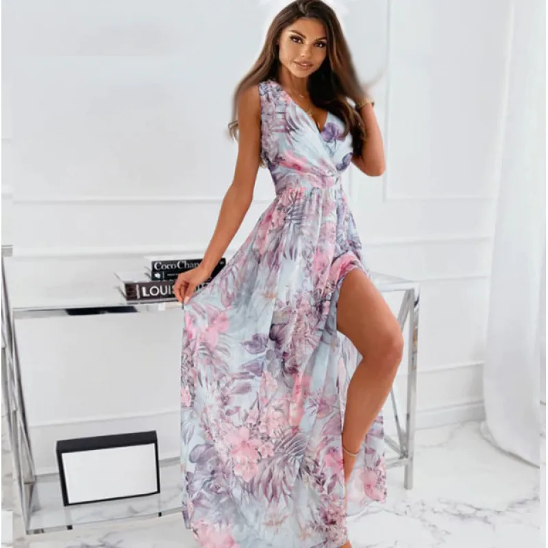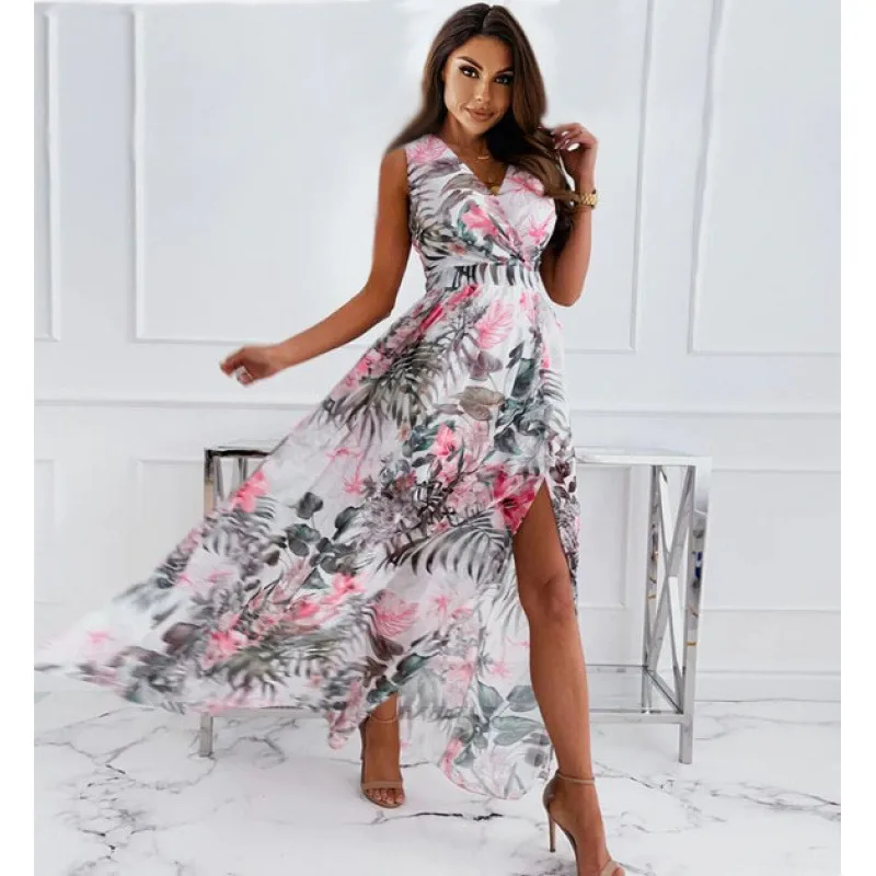 Wholesale Women's Sheath Dress Streetwear V Neck Sleeveless Flower Maxi Long Dress Holiday