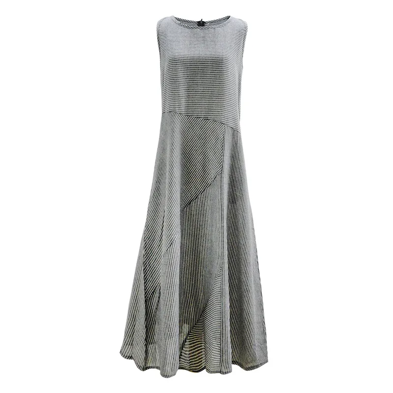 Wholesale women's straight skirt casual round neck printing pocket sleeveless stripe solid color midi dress daily