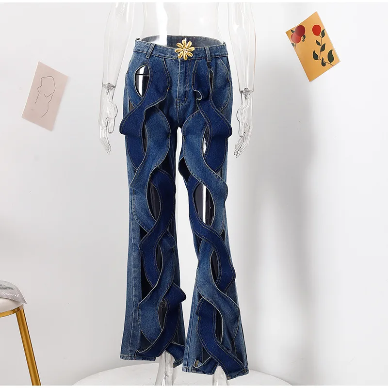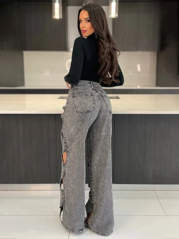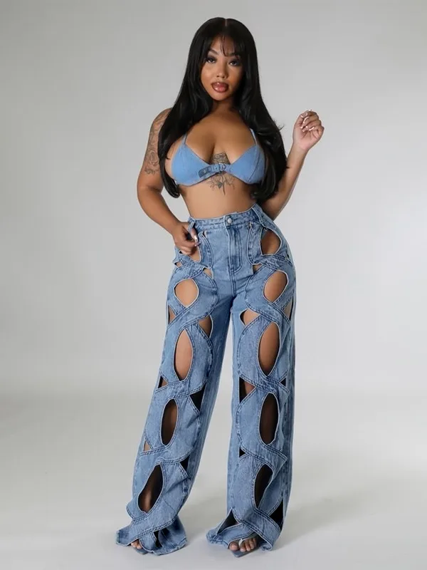 Wholesale Women's Street Sexy Solid Color Full Length Hollow Out Jeans
