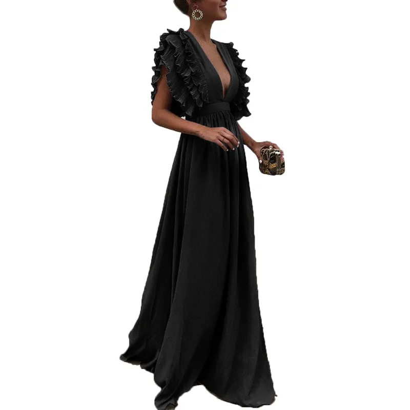 Wholesale Women's Swing Dress Elegant Sexy Plunging Neck Ruffles Backless Short Sleeve Solid Color Maxi Long Dress Banquet Cocktail Party