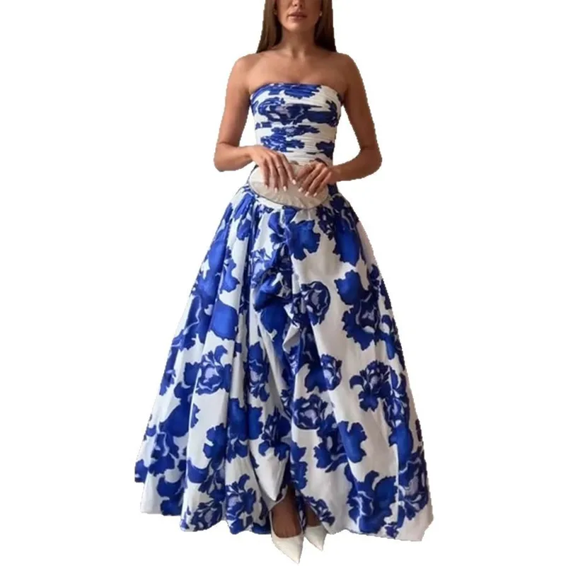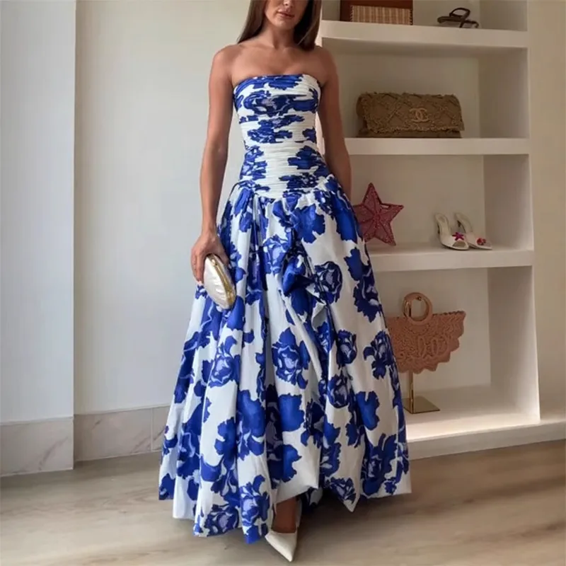 Wholesale Women's Swing Dress Elegant Strapless Pleated Sleeveless Flower Maxi Long Dress Holiday Daily