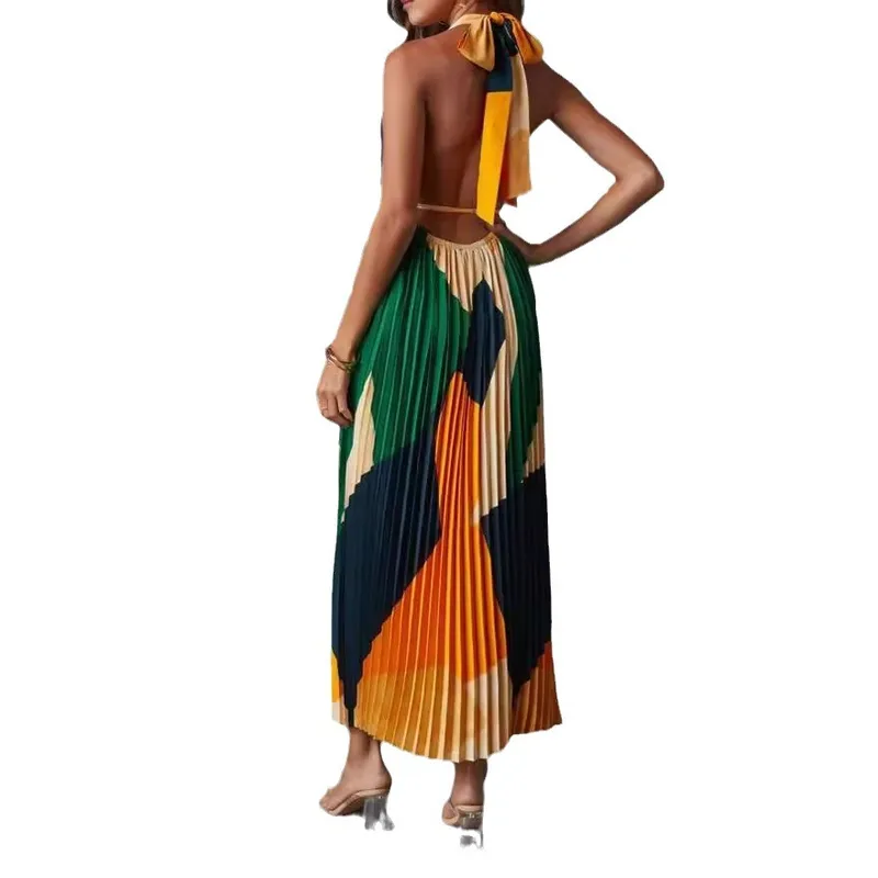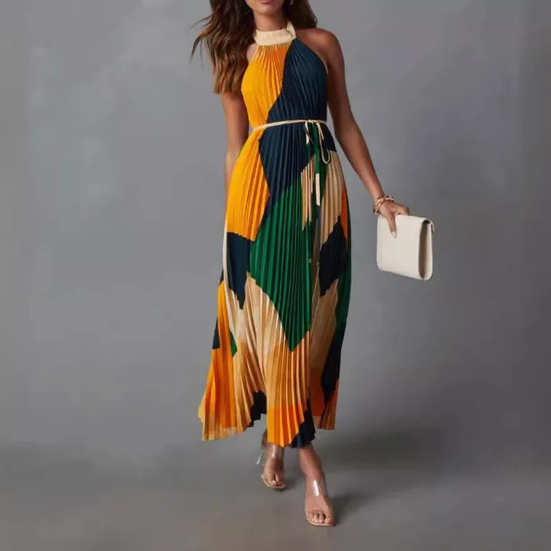Wholesale Women's Swing Dress Elegant Streetwear Halter Neck Printing Sleeveless Color Block Maxi Long Dress Holiday Daily