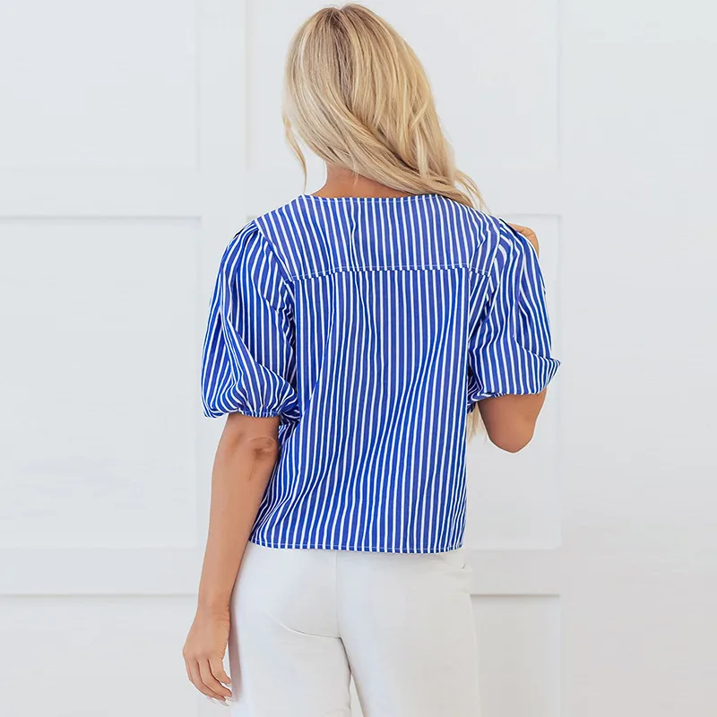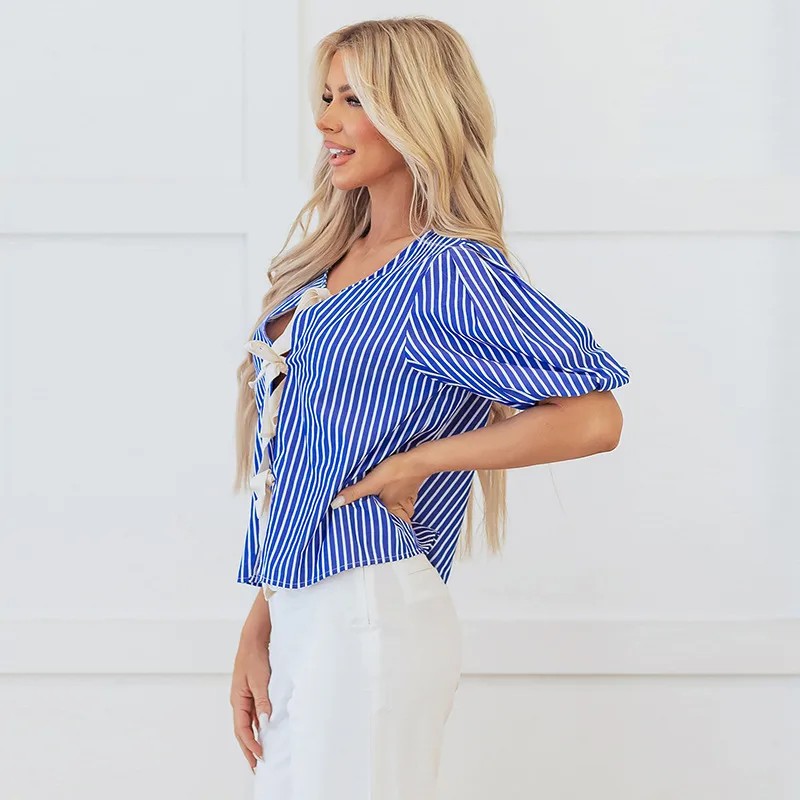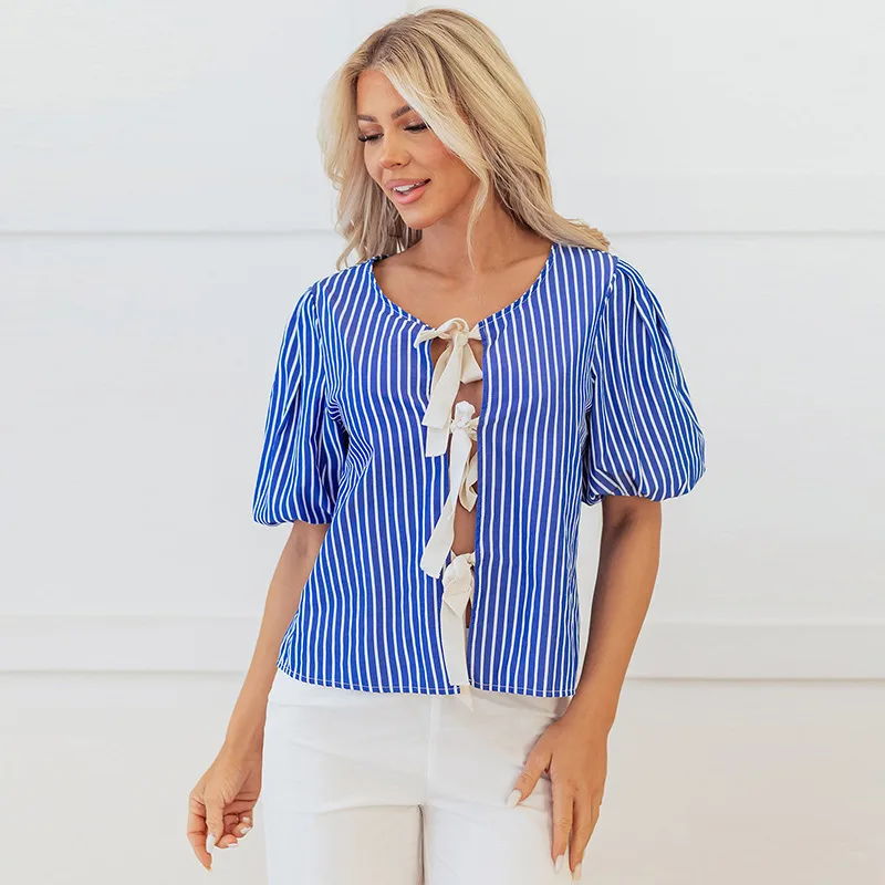 Wholesale Women's T-shirt Short Sleeve Blouses Bowknot Hollow Out Casual Stripe