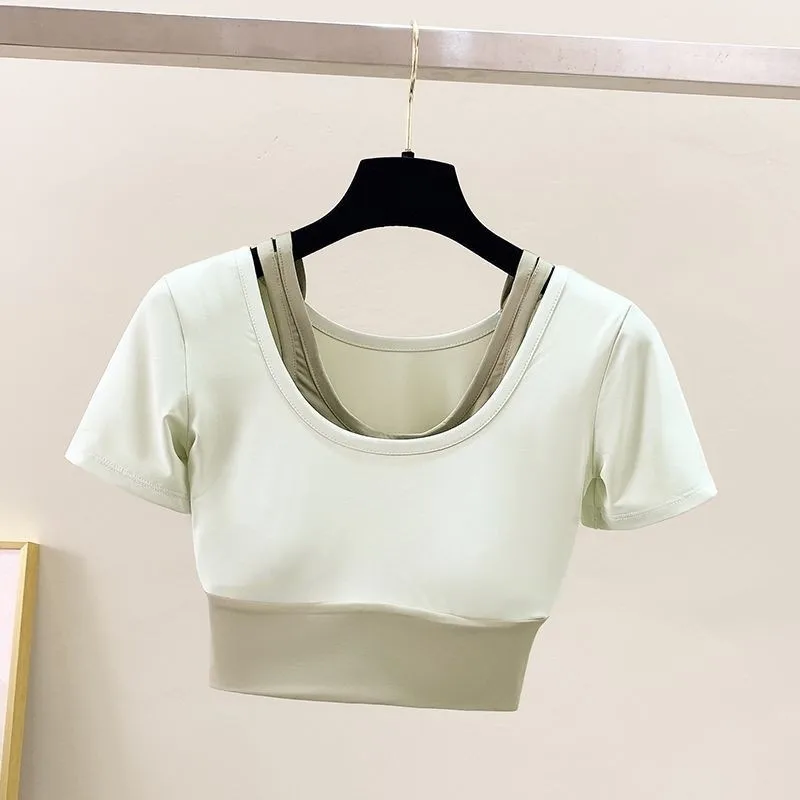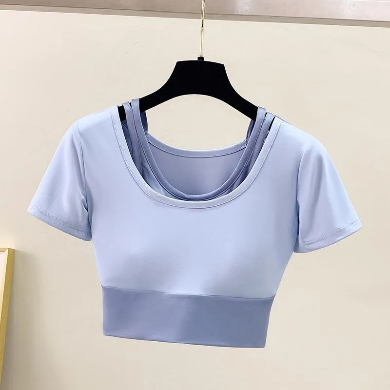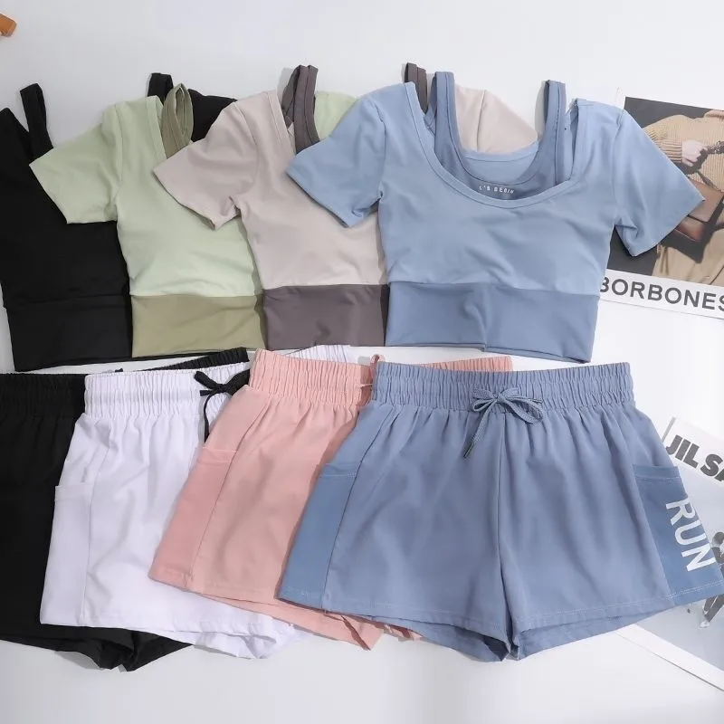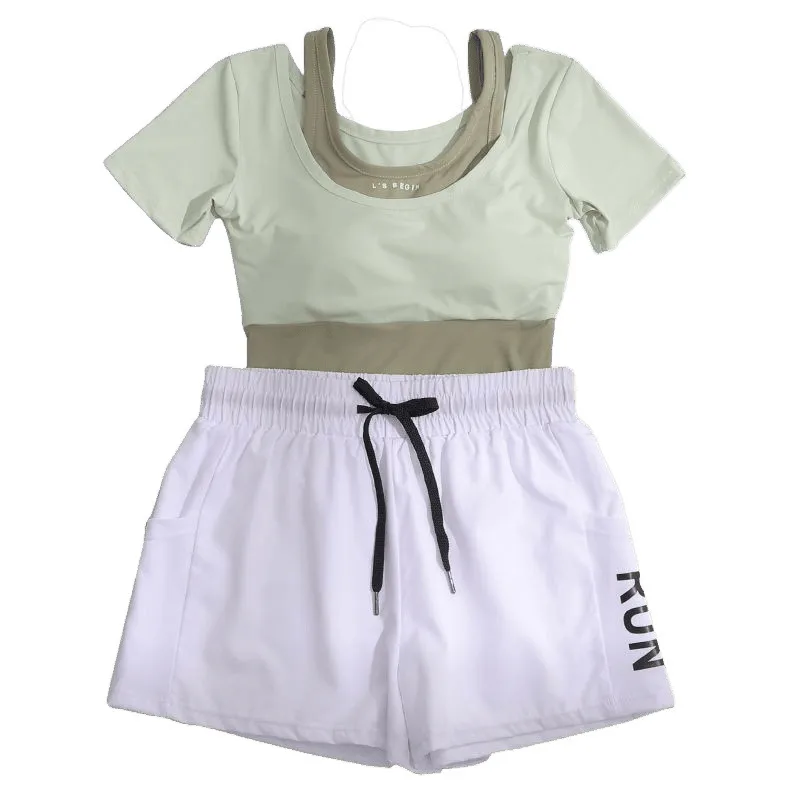 Yoga Clothes For Small People, A Complete Set Of Fake Two-Piece Tops With Chest Pads + Slim Shorts Running Suit For Women's Morning Running Trend